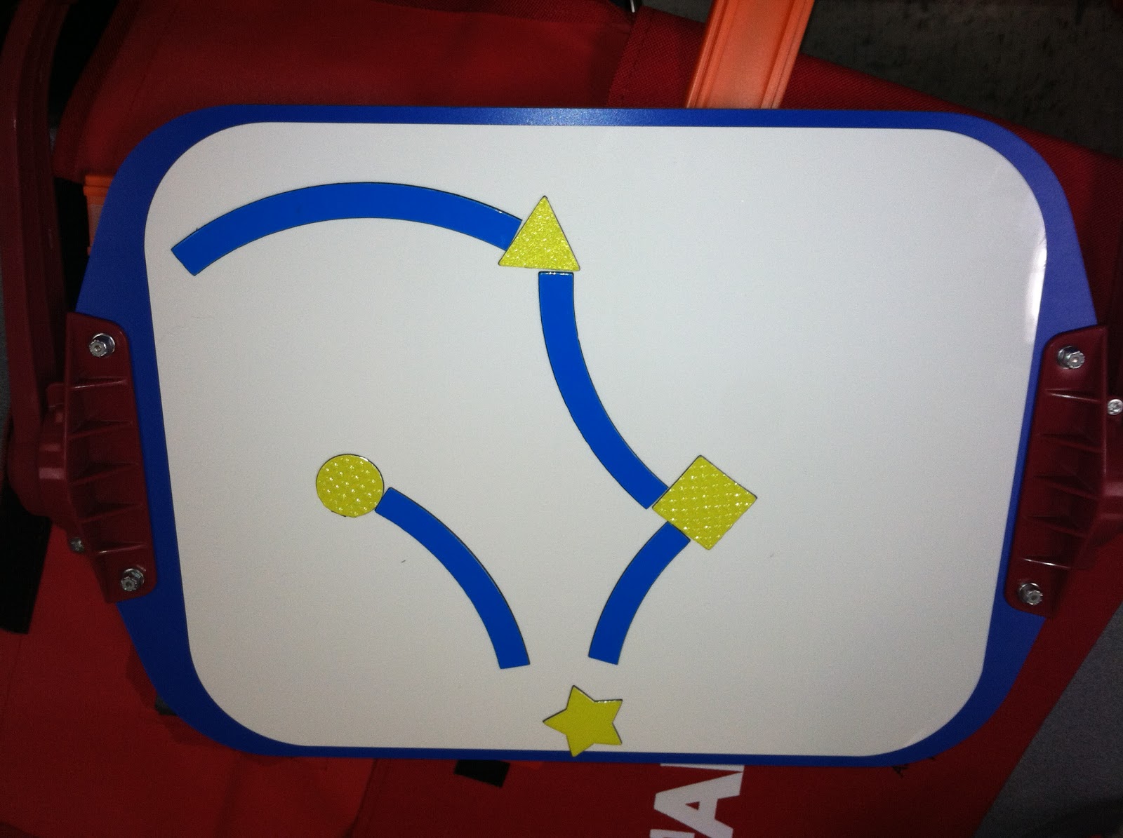 This is an all-in-one board. The awesome thing that Yvonne did was add race tracks. The race tracks work for tracking skills, direction development. The student practice tracking the track (notice the bump dot notches as place markers). She also took a race track and put velcro down the center of it. She attaches different shapes that the student has to find. Genius!